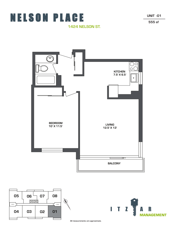 | 01 - 1 bd, 1 bath with balcony | 1 | 1 | 555 | $2,300 /MO | $1,150 | |
